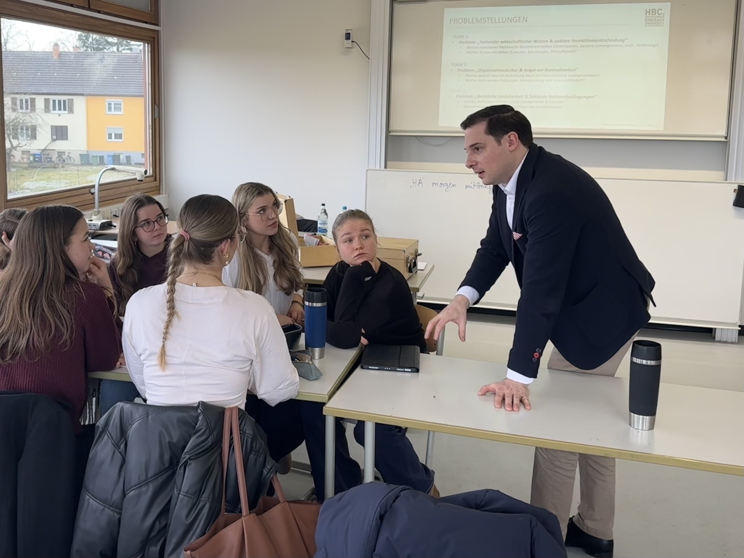 Wollt ihr das Subjekt oder das Objekt der Veränderungen der Zukunft sein? Fragte Professor Dr. habil. Vinzenz Krause von der Hochschule Biberach die Schülerinnen und Schüler der J2 im Leistungsfach Wirtschaft. In seiner Keynote ging er auf die aktuellen innovativen Entwicklungen in der Welt ein. Anschließend führte er mit dem Kurs einen Hackathon durch. Ein Hackathon ist ein zeitlich begrenztes Innovationsformat, bei dem Teams gemeinsam an konkreten Problemstellungen arbeiten und in kurzer Zeit kreative Lösungen entwickeln. In einer intensiven Arbeitsatmosphäre setzten die Teilnehmenden eigene Ideen um und lernten. Der Hackathon war hochinteressant und hochspannend.