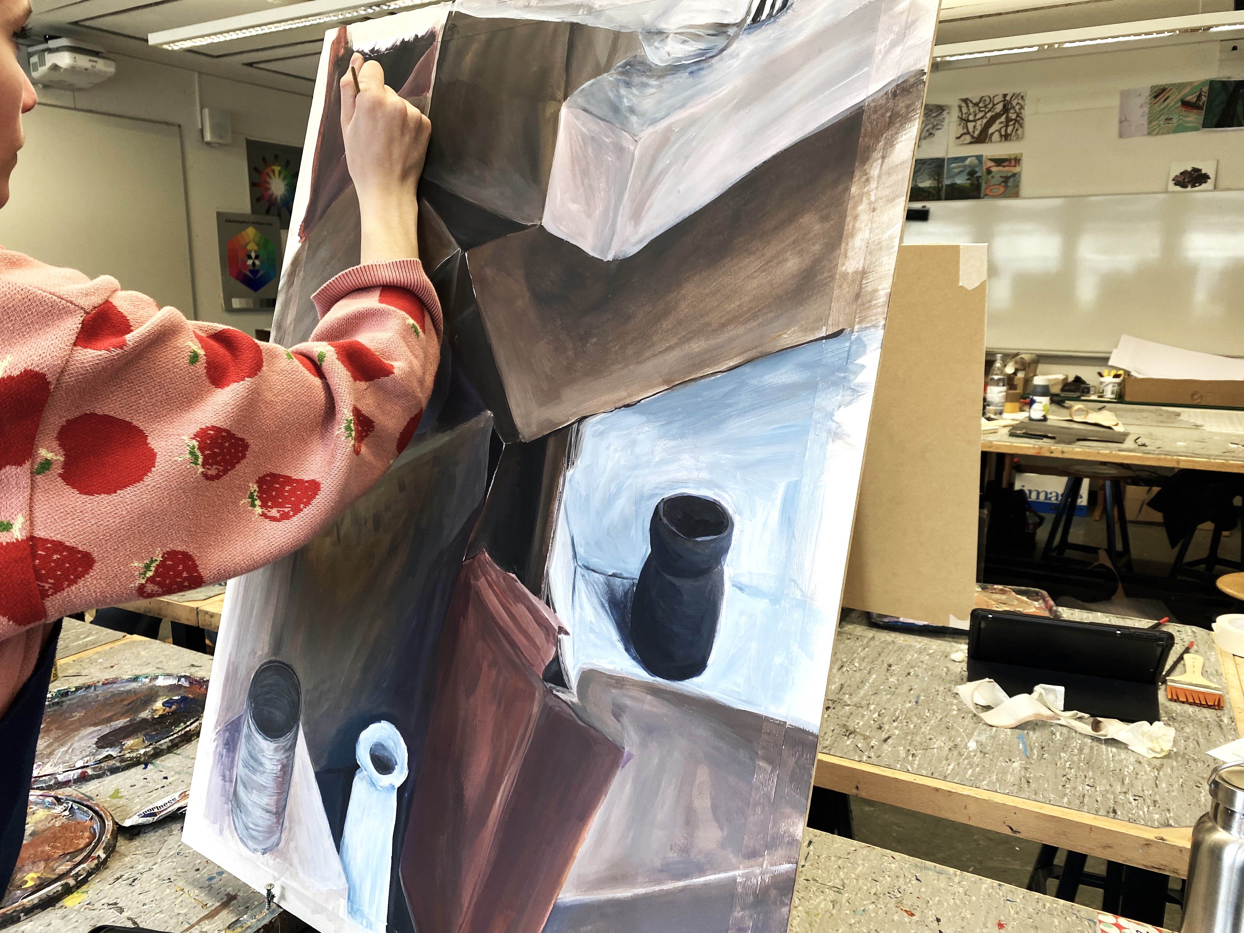 Die Schülerinnen und Schüler des Leistungsfachs Bildende Kunst sind mit ihrer fachpraktischen Prüfung in die heiße Phase des Abiturs 2026 gestartet. In diesem Jahr wurde ein Stilllebenturm gemalt. Gestapelte Kartons und Kisten wurden hierbei zur Präsentationsfläche von Vasen und Gläsern. Die Prüflinge skizzierten einzelne Turmfragmente und fügten diese zu einer abstrahierten, ausschnitthaften Komposition zusammen, die malerisch ausgestaltet wurde. Auch wurde dieses Jahr zum ersten Mal eine Performance als Prüfungsformat angeboten. Ein Flugobjekt sollte aus Pappe und Folie gebaut und in einer Performance getestet werden. Die Idee war es hier, dass Körper und Objekt eins werden und das Fliegen in seiner Vielfalt in mehreren Fotos dokumentiert wird, um zu zeigen: Gelingt dies besser als Ikarus? Wir denken: ja!