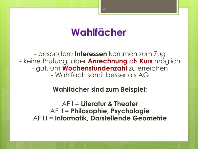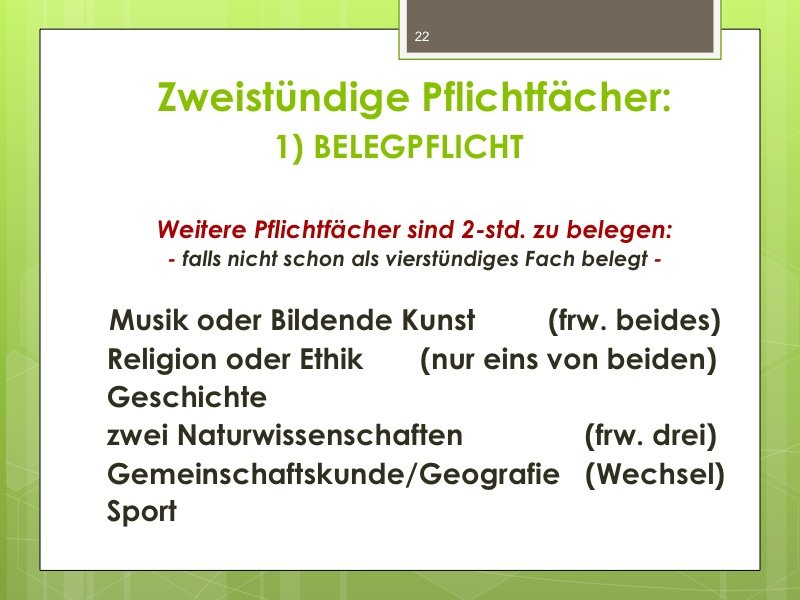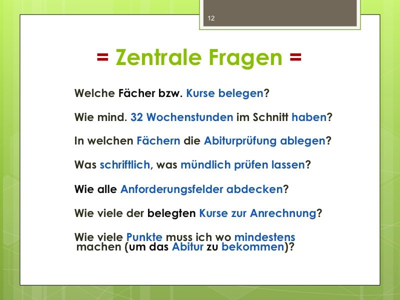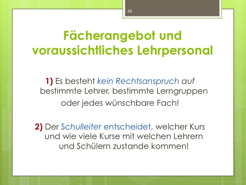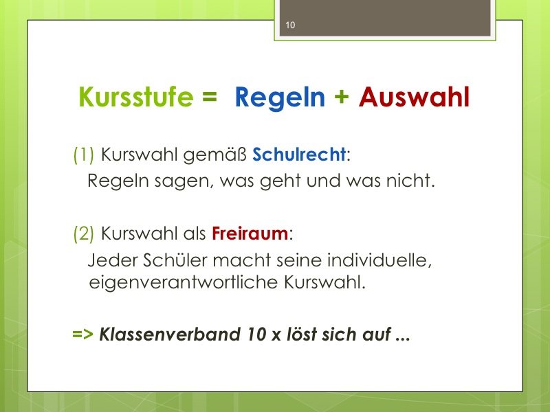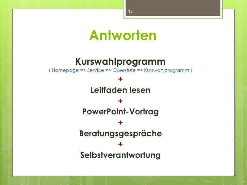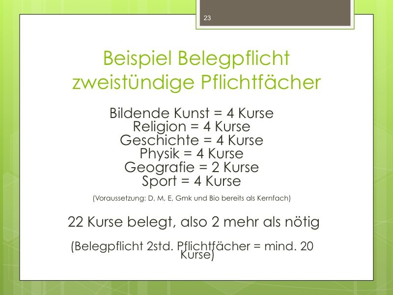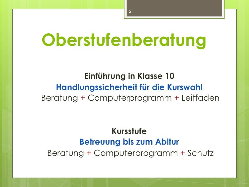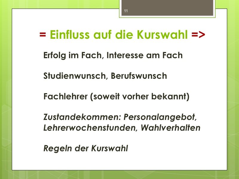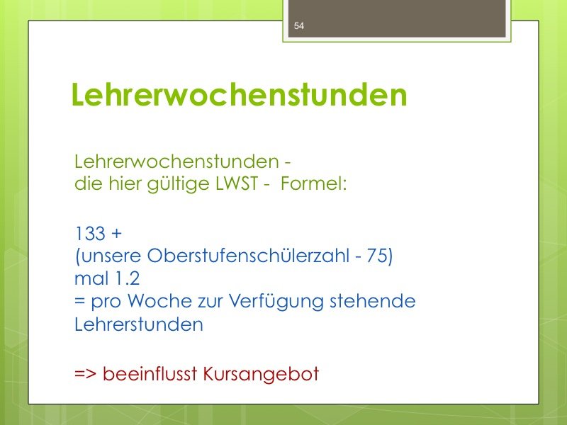 Ich werde den Weg ausschildern und Sie im Eingangsbereich begrüßen. Der Vortrag wird ungefähr eine Stunde dauern und einen Durchgang durch das Kurswahlprogramm mit einschließen. Ihre Anwesenheit ist erwünscht und angesichts des Alters Ihres Kindes in G8 sicherlich sinnvoll, aber nicht verpflichtend. Vielleicht können Sie es ja möglich machen, dass ein Elternteil kommt.