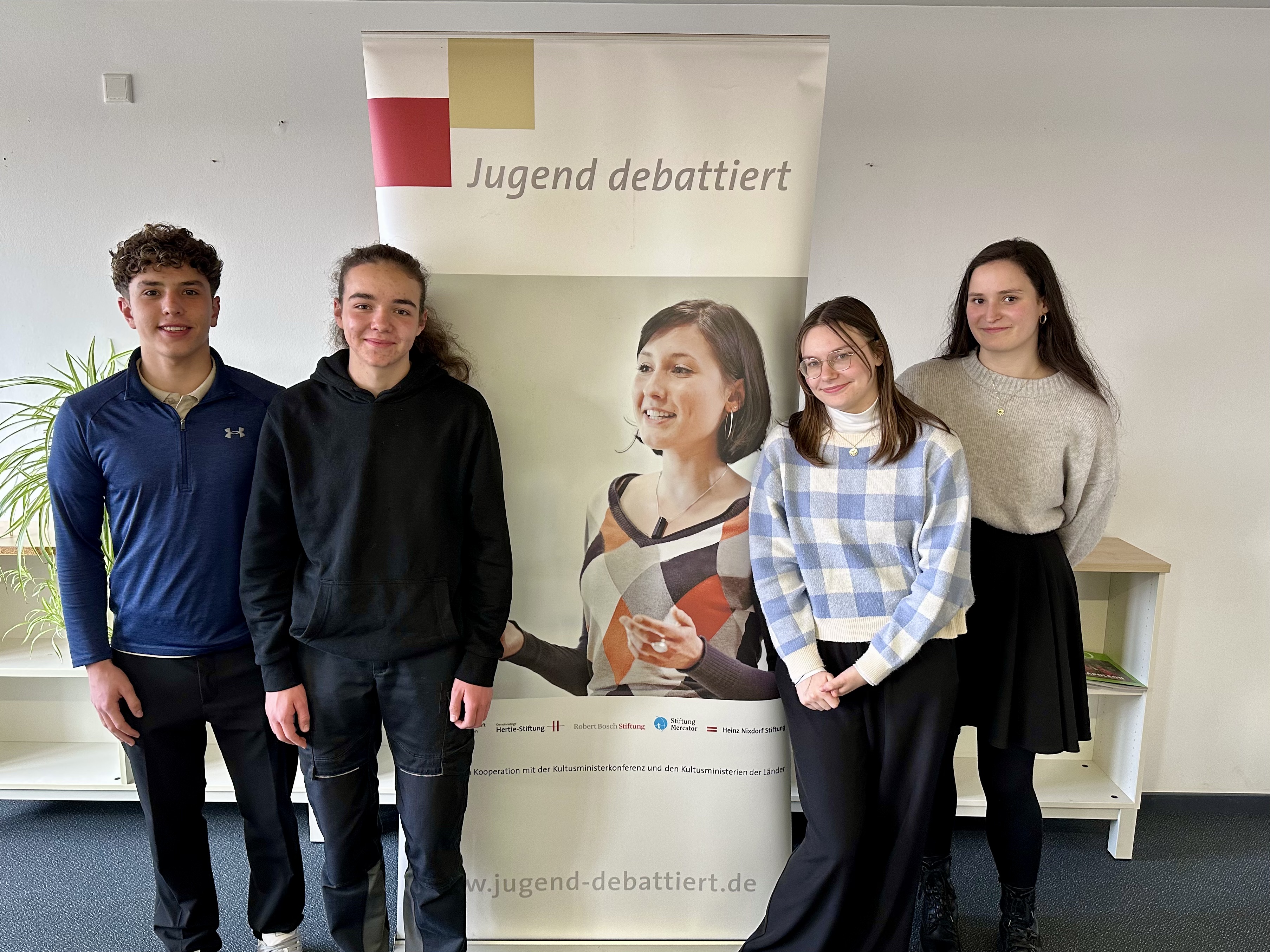 Rhetorische Höchstleistungen hat die Debattiergruppe des Störck-Gymnasiums beim Regionalfinale des Wettbewerbs "Jugend debattiert“ am vergangenen Freitag an der Liebfrauenschule in Sigmaringen gezeigt. Zu den Themen „Soll das Rauchen in der Öffentlichkeit verboten werden?“ und „Soll ehrenamtlich Engagierten ein staatlicher Zuschuss zum Führerschein gewährt werden?“ diskutierten die Schulsieger Kilian Harras und Hannah Holderried mit Vertreterinnen und Vertreterinnen anderer Schulen. Dabei überzeugten sie mit fundierten Fakten, klaren Thesen und präziser Beweisführung. Zu jeder Zeit konnten sie durch ihr souveränes Auftreten im dynamischen Schlagabtausch bestehen. Jenny Miller und Rocco Curcio beteiligten sich zudem an der Jury der Debattierrunden anderer Schulteams. Hier bewiesen sie bei Beobachtung und Bewertung immer tolle Sachkenntnis und gutes Augenmaß. Für den Sieg hat es am Ende nicht ganz gereicht. Das Gymnasium Leutkirch gewann den Entscheid und ist eine Runde weiter.